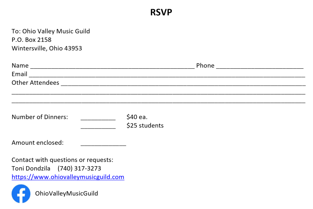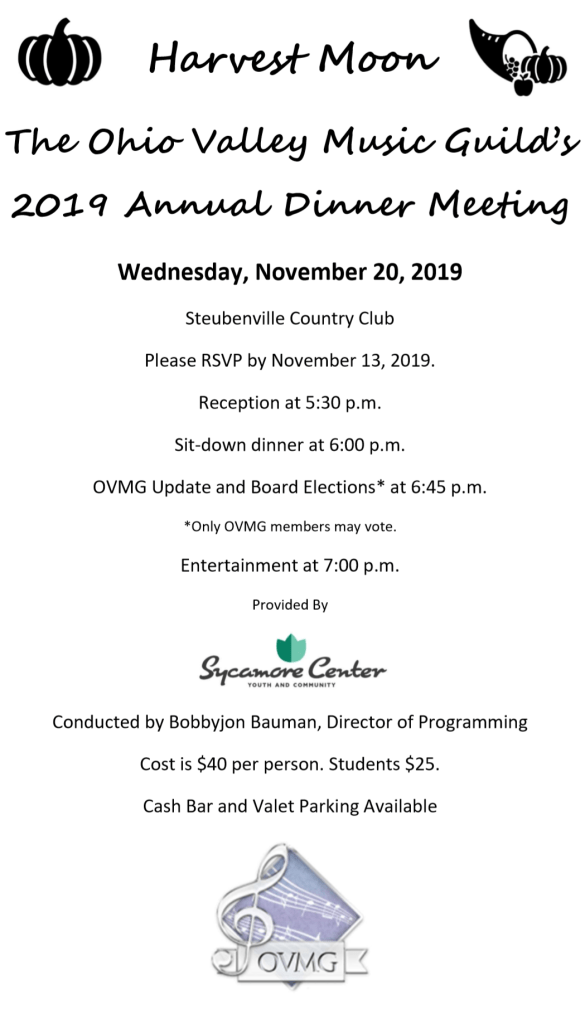 The Ohio Valley Music Guild proudly invites you to our 2019 Annual Membership meeting. Please join us for a sit-down dinner and an evening of entertainment, provided by the Sycamore Center’s Ohio Valley YOUTH Network and conducted by Bobbyjon Bauman, on Wednesday, November 20, 2019, at the Steubenville Country Club (413 Lovers Lane, Steubenville, OH).